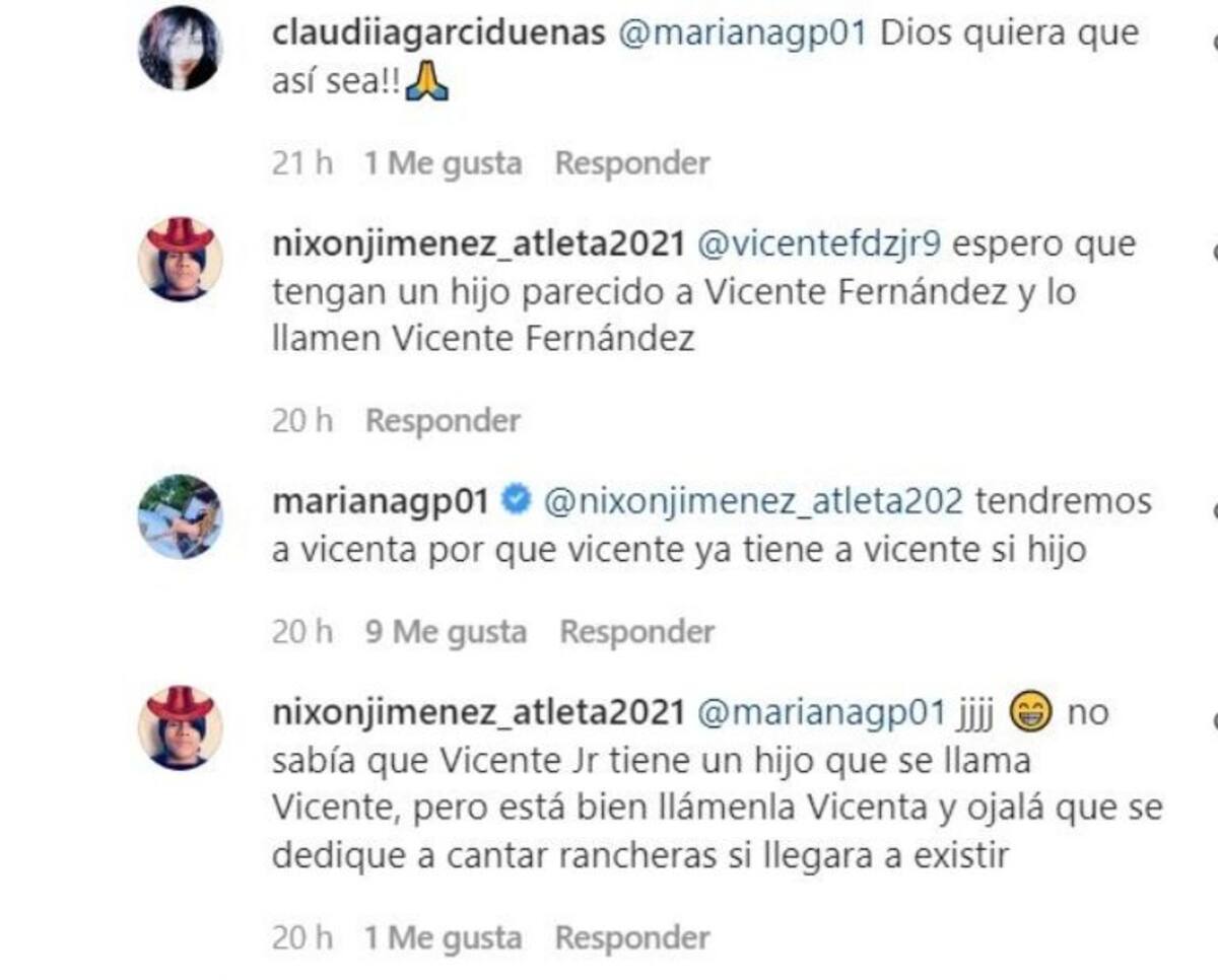 De inmediato seguidores de la pareja celebraron su amor diciéndoles que ya es momento de casarse y formar una familia, a lo que Mariana amablemente respondió: “Tendremos a Vicenta porque Vicente ya tiene a Vicente, su hijo”.