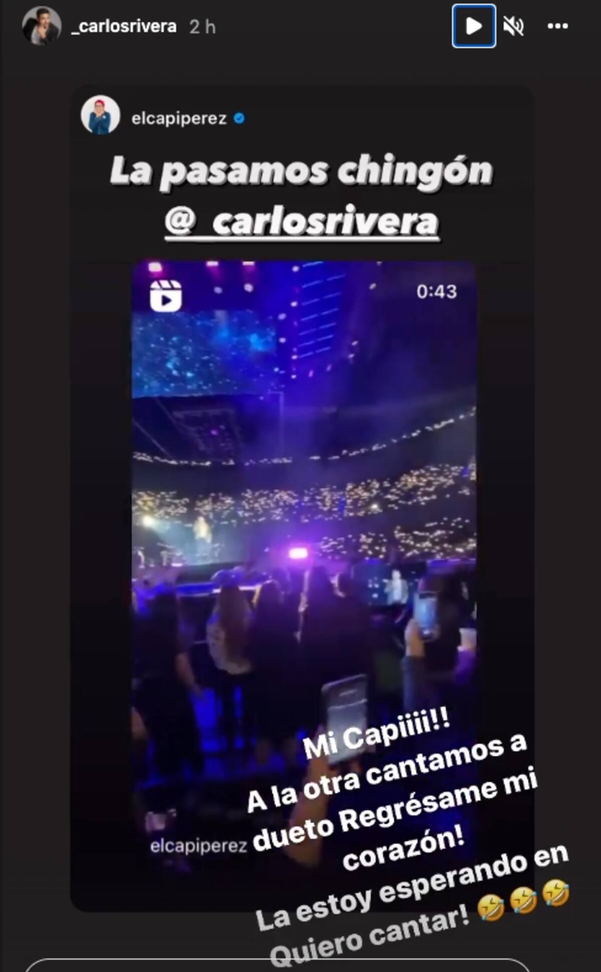 "El Capi" Pérez, escribió a Carlos Rivera: "La pasamos ch*ngón". A lo que el cantante le respondió: "Mi Capiiiiiiiiii!! A la otra cantamos a dueto Regrésame mi corazón! La estoy esperando en Quiero Cantar (el concurso de Venga La Alegría)!".