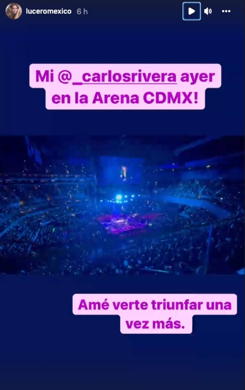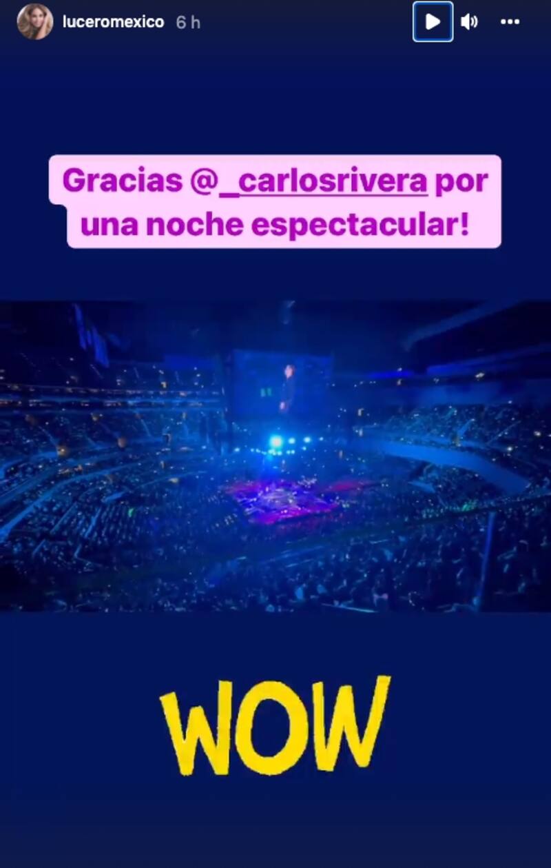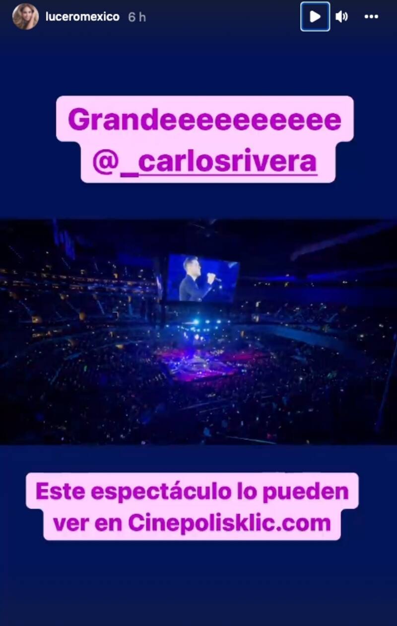 Mientras que en los siguientes videos, también del concierto escribió: "Gracias @_carlosrivera por una noche espectacular!", además de recordar a sus seguidores ver el espectáculo en "cinepolisklic.com". Fue así como Lucero demostró su apoyo a Carlos Rivera.