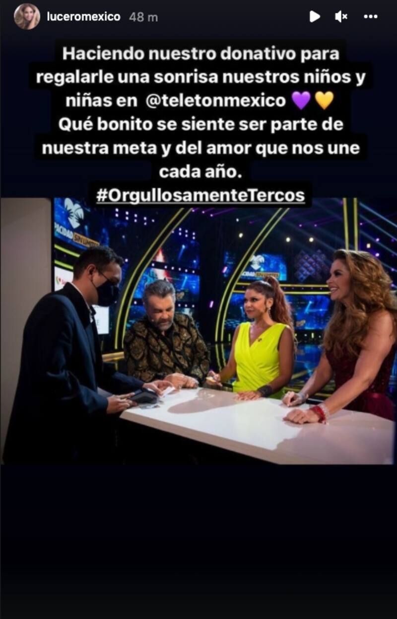 Además de la publicación en su feed, Lucero compartió en sus Instagram Stories, un mensaje para invitar a la gente a donar al Teletón: "Mis adorados, para recordarles que hoy es Teletón México, hoy es cuando solo necesitamos de su ayuda, de su apoyo, de sus donativos para poder alcanzar esta meta, esta noche porque unidos somos más, contamos contigo, Teletón México, venga".
