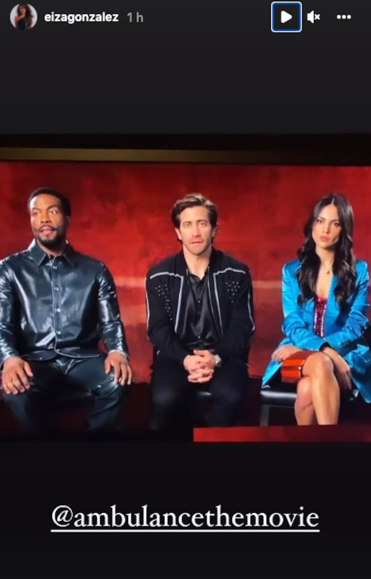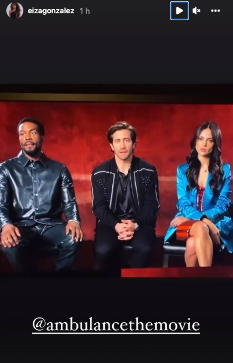 Para acompañar las fotografías, Eiza González escribió: "We are back for @ambulancethemovie press in full Tom Ford". Así como compartió un par de Instagram Stories, una junto a Jake Gyllenhaal y Yahya Abdul-Mateen II en una entrevista, así como un vistazo más de cerca a su maquillaje.