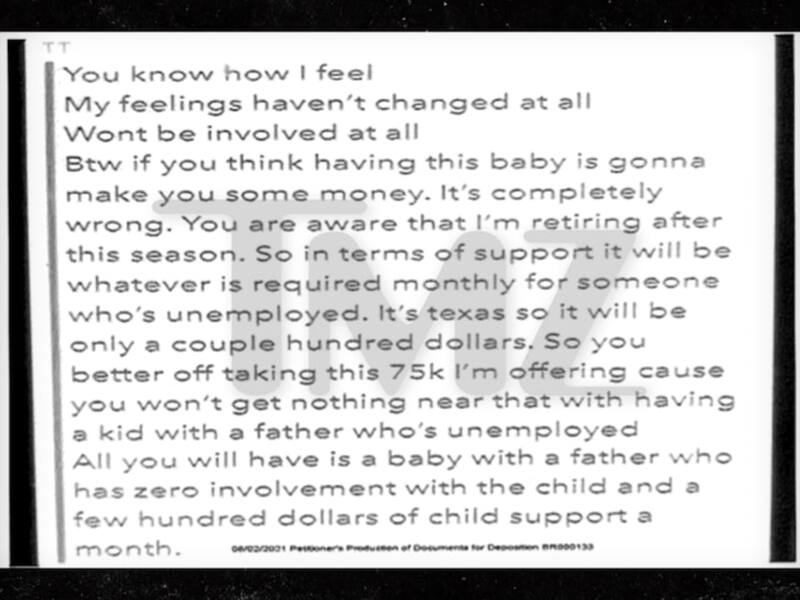 "Sabes cómo me siento. Mis sentimientos no han cambiado. No estaré involucrado. Si crees que este bebé te dará dinero, estás completamente mal. Sabes que me retiraré después de esta temporada. En términos de manutención será la cantidad que te toque de alguien que no tiene trabajo", se lee.