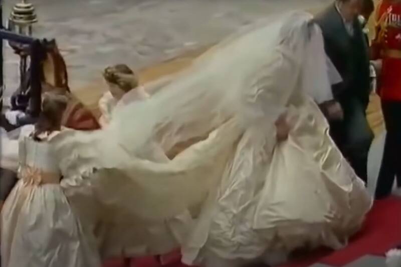 4-El Carruaje: Lady Di, hizo un pedido especial a los diseñadores, la cola de su vestido debía ser la más larga que hubiera existido en cualquier boda real, su longitud fue de 7.62 metros. Pero ninguno contó con que el carruaje que la llevaría a la iglesia era demasiado pequeño, por lo que tuvieron que doblar la tela para que pudiera entrar, lamentablemente eso provocó que el vestido se arrugara demasiado y este hecho fue muy evidente en el vídeo que captó su arribo a la iglesia.
