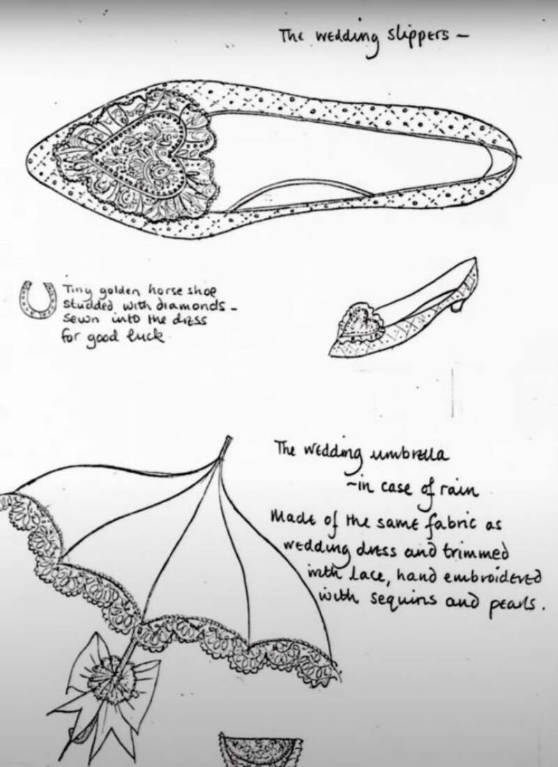Los zapatos tardaron 6 meses en estar listos, entre su diseño y producción. El tacón era mínimo, pues Diana era tan alta como el príncipe Carlos y no debía evidenciarlo. Los zapatos estaban cubiertos de encaje y lentejuelas, además tenían un elemento romántico personalizado, pues sobre el arco de cada zapato estaban pintada las iniciales "C y D".