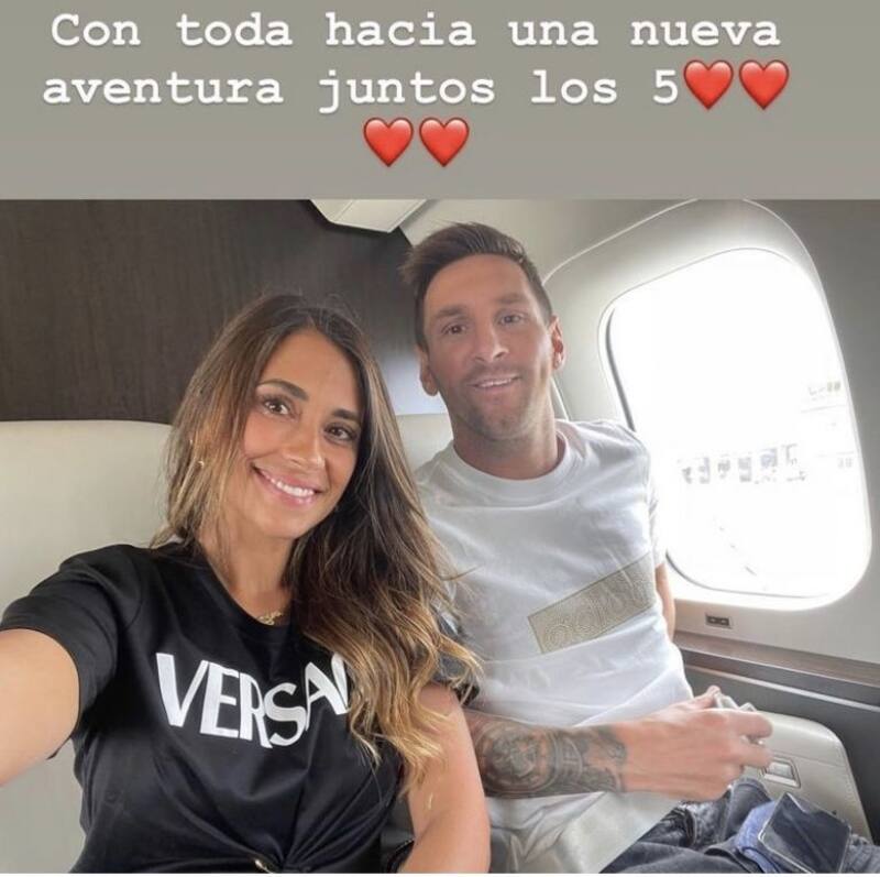 A través de sus Instagram stories, Antonela escribió: “Con toda hacia una nueva aventura juntos los 5”. Su texto va acompañado de una imagen de ella y Messi a bordo del avión y cuatro corazones rojos.