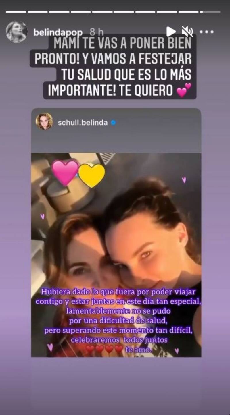 Los hechos expuestos por la revista coinciden con una de las últimas historias de Instagram publicadas por Belinda, la cual es una réplica del mensaje de su madre, en el que lamentó no haber podido festejar con su hija su cumpleaños.