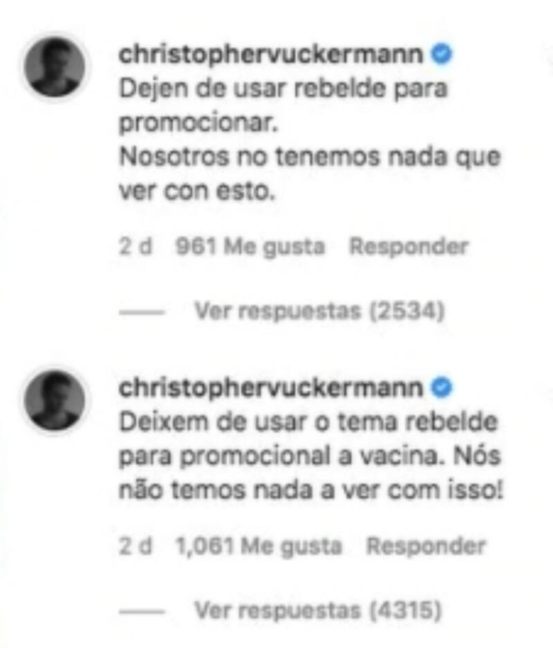 Christopher Uckermann respondió al posteo y escribió: "Dejen de usar rebelde para promocionar. Nosotros no tenemos nada que ver con esto", tanto en español como en portugués, a lo cual reaccionaron los fans brasileños en contra del exRBD.