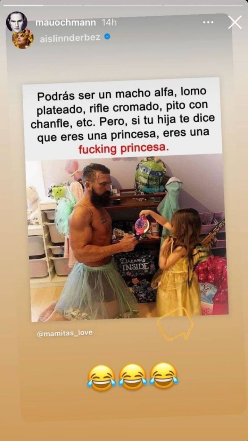 Antes de las vacaciones de Mauricio Ochmann con Paulina Burrola y la pequeña Kailani, Aislinn Derbez compartió una imagen sobre un papá que se disfrazaba de princesa para jugar con su hija, la cual reposteó Mauricio Ochamann.