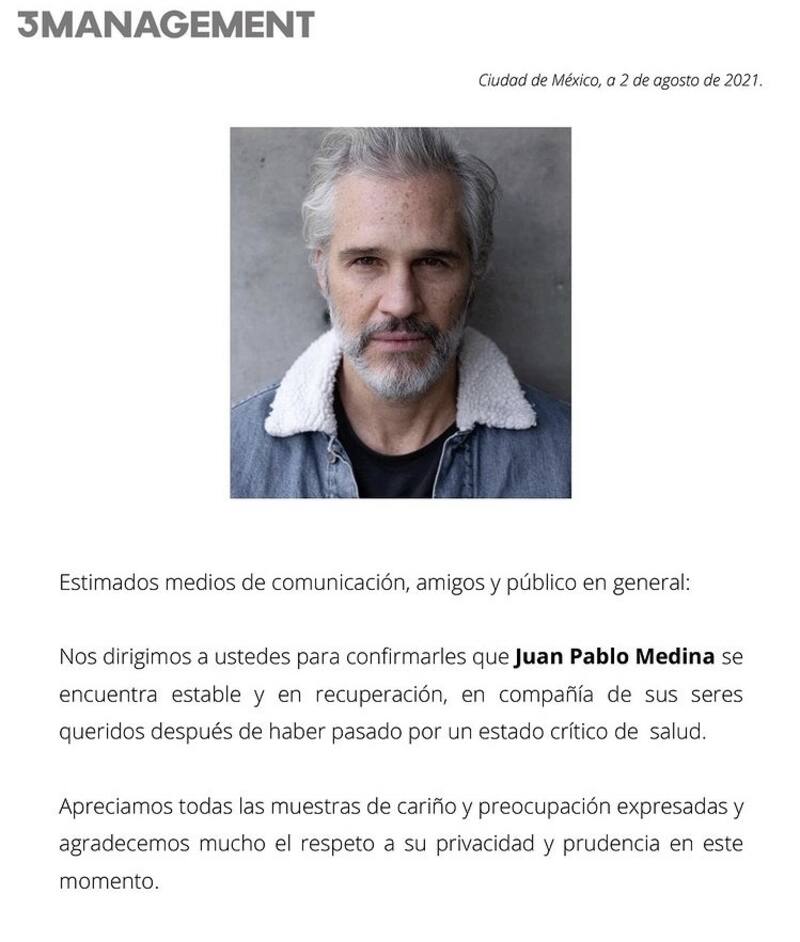 El periodista Javier Poza y los conductores de la emisión "De Primera Mano" dieron a conocer que el conocido actor de cine y televisión Juan Pablo Medina, está hospitalizado debido a que sufrió una fuerte trombosis.
