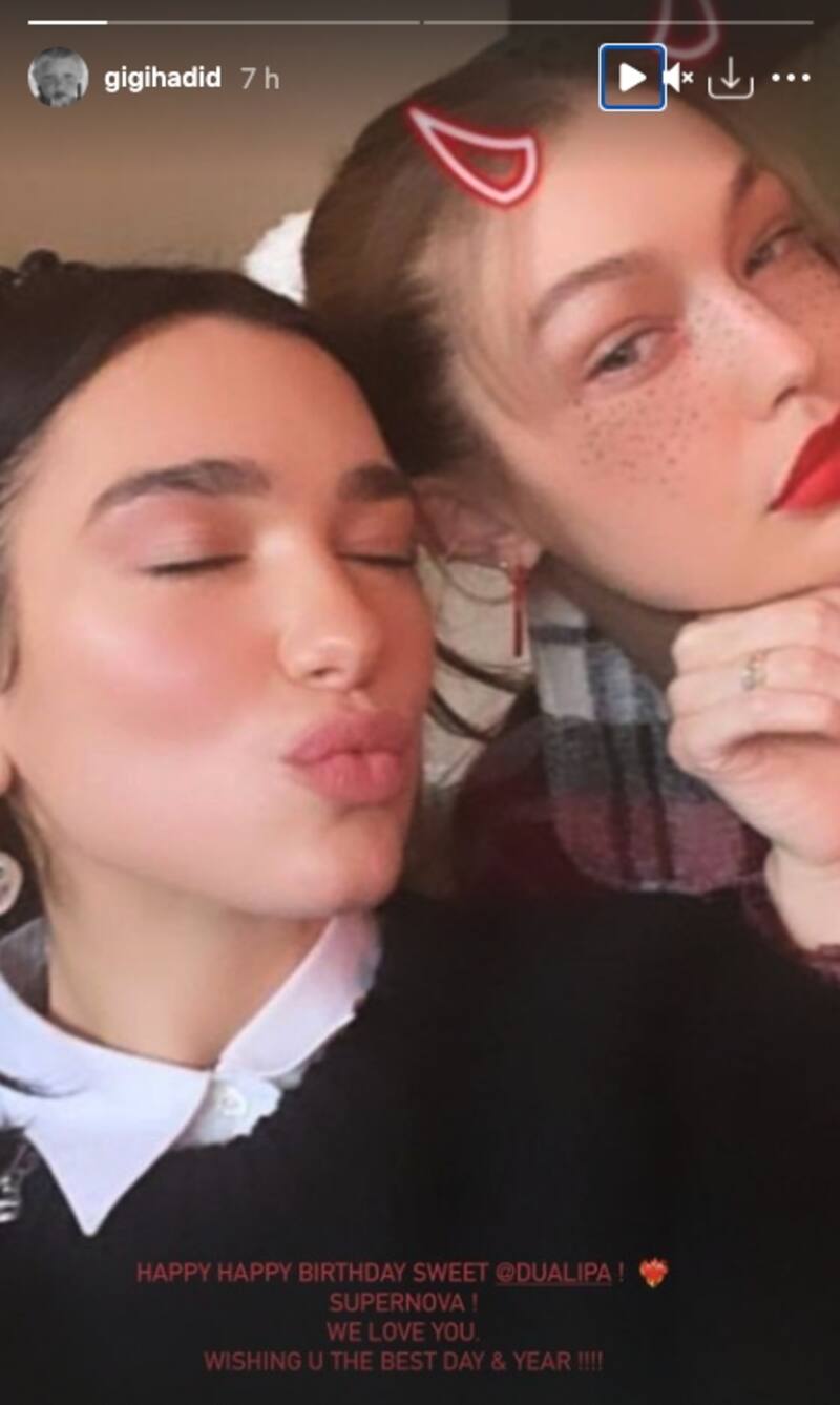 Por su parte, la modelo Gigi Hadid compartió una selfie junto a Dua Lipa en la que escribió: "Feliz feliz cumpleaños dulce @dualipa! Supernova! Te amamos. Deseándote el mejor día y año!!!!".