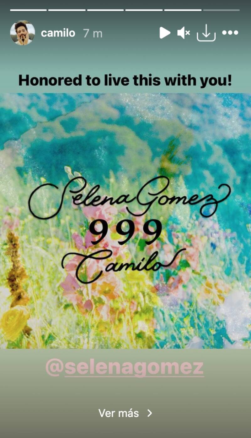 Selena Gómez y Camilo anunciaron una nueva colaboración en conjunto, que lleva por nombre "999", lo cual fue anunciado por la estadounidense a través de sus Instagram Stories en las que publicó la imagen de un paisaje de ensueño, en la que encima aparece "Selena Gomez 999 Camilo", la portada del nuevo sencillo .
