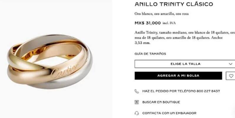 La sortija es de la marca Cartier de tres oros: blanco 18 quilates, oro rosa de 18 quilates y oro amarillo de 18 quilates. La primera vez que se le vio a Belinda fue en los festejos de la promotora Danna Vázquez.