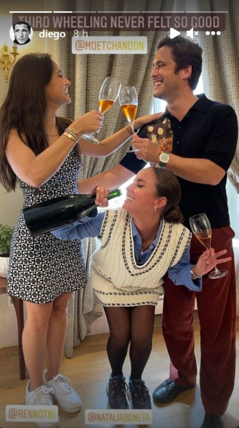 A través de sus historias, Notni compartió un divertido video en el que se le puede ver vertiendo champagne desde lo alto de una torre de copas, mientras su novio la sostiene de los pies para evitar algún accidente.
