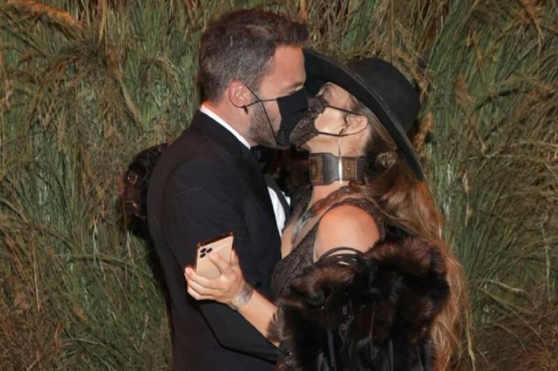 La pareja cerró con broche de oro su aparición con un romántico beso, encima de sus respectivos cubrebocas. Al mismo tiempo, JLo se aferraba a su iPhone 12 para que no se le cayera.