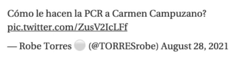 El usuario se burló de la nariz de la exmodelo y escribió en Twitter: “¿Cómo le hacen la PCR a Carmen Campuzano?". El tweet que se volvió viral y fue difundido por otros usuarios, quienes no dudaron en mencionar a Carmen Campuzano para que le llegara el mensaje.