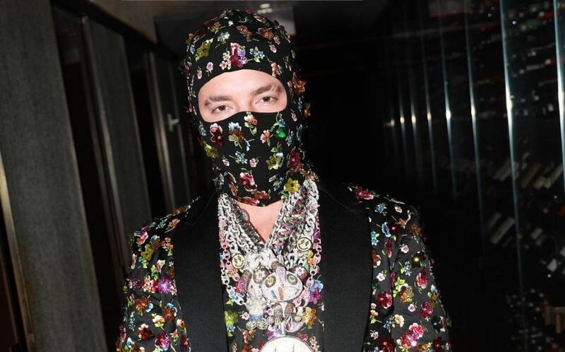 Para acompañar su estilismo lleno de flores de colores, J Balvin llevó un pasamontañas con el mismo estampado, así como un gran número de cadenas sujetadas de su cuello de diferentes tamaños, que además tenían diversos dijes, como el logo de carita del colombiano.