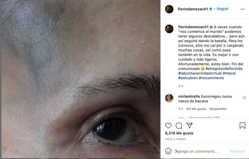En el post, la actriz aseguró que el golpe fue a causa de una caída y no por alguna enfermedad. Comentó a sus seguidores, a quienes llama de cariño "la vecindad virtual", que se encuentra bien y seguirá dando pelea.