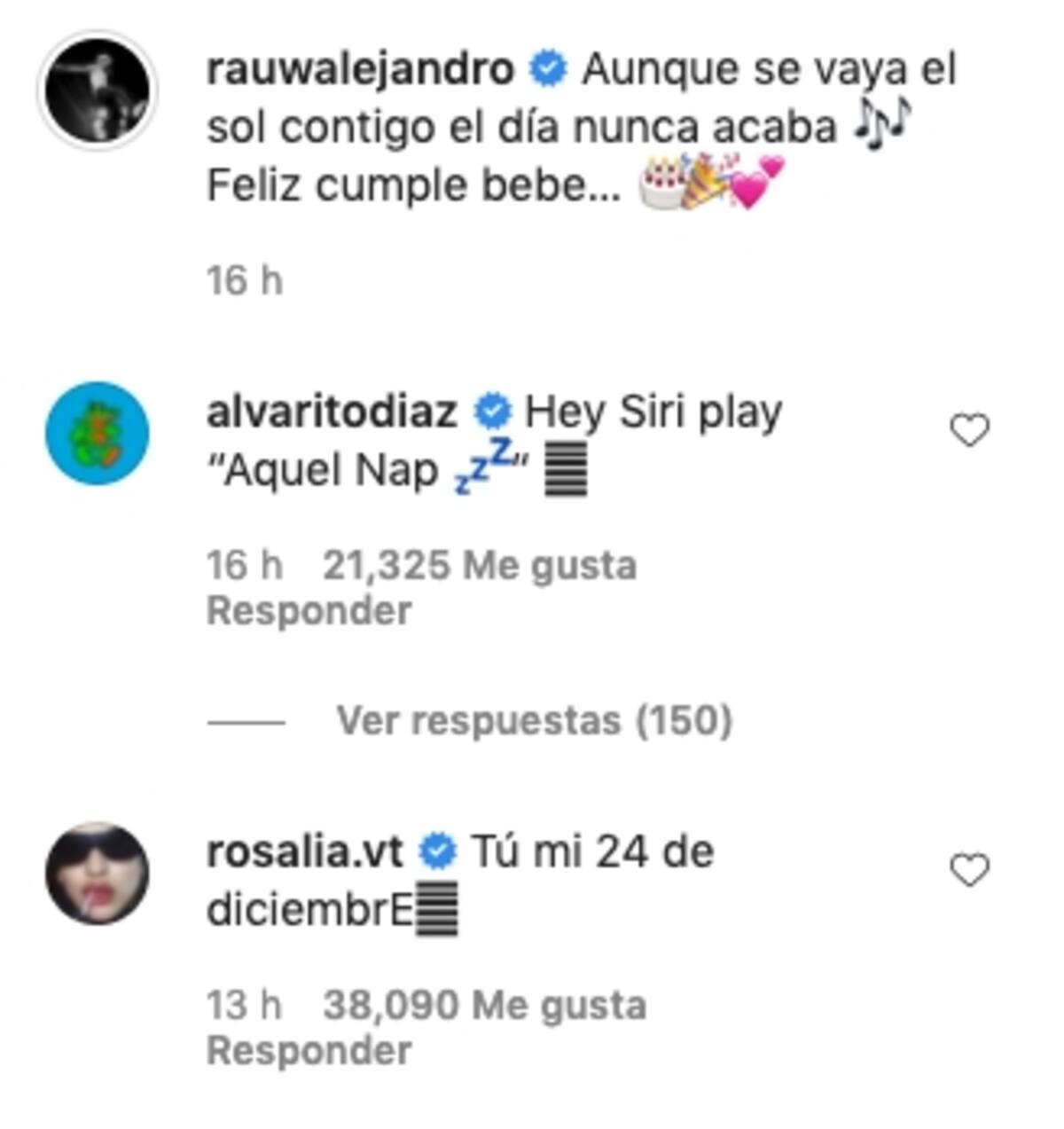 Rosalía respondió a la publicación con un "Tú mi 24 de diciembre", que también forma parte del tema compuesto e interpretado por el puertorriqueño, quien además, en sus Instagram Stories, compartió otra imagen con la española, en la que agregó: "Baby yo te sigo hahaha". Es un hecho, Rosalía y Rauw Alejandro están enamorados.