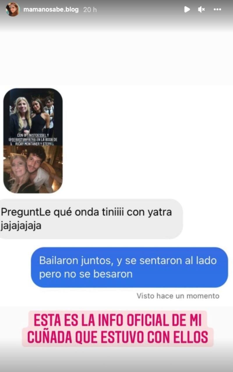 Fue debido a las publicaciones de la bloguera Leila Nahmod, mejor conocida como "Mama no sabe" en Instagram, que los rumores de que Tini y Sebastián Yatra estuvieron juntos en la boda de Ricky Montaner, fueron confirmados.