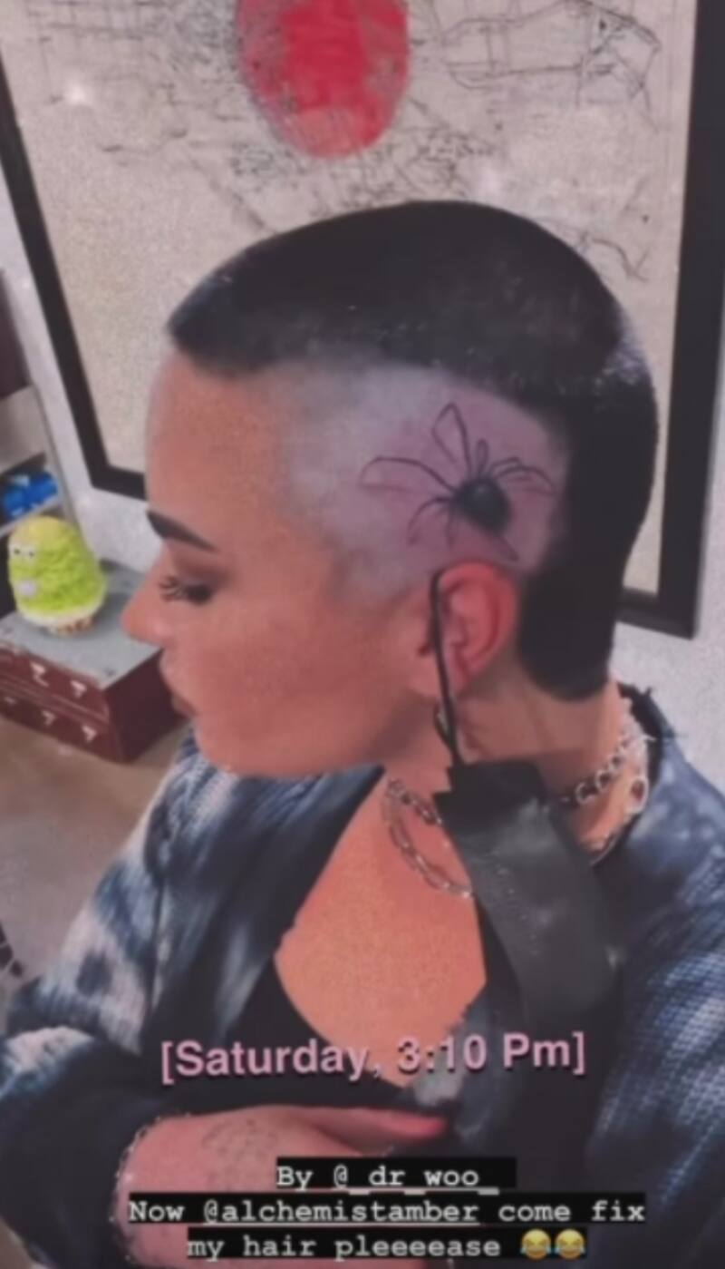 A través de historias en @ddlovato para sus 123 millones de seguidores, publicó un par de fotografías presumiendo su nuevo y enorme tatuaje de araña en la cabeza. Para acompañarlo escribió: