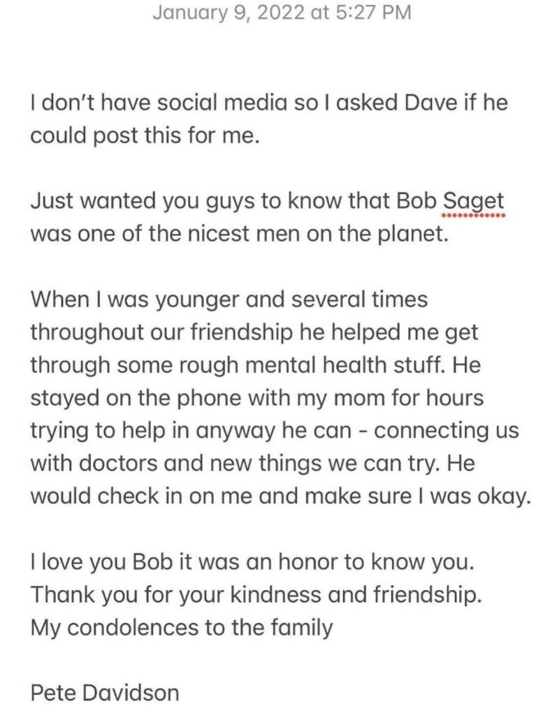 Para finalizar, Pete Davidson, que hace algún tiempo fue diagnosticado con un trastorno límite de la personalidad, agradeció a Bob por su amistad y envió sus condolencias a la familia.