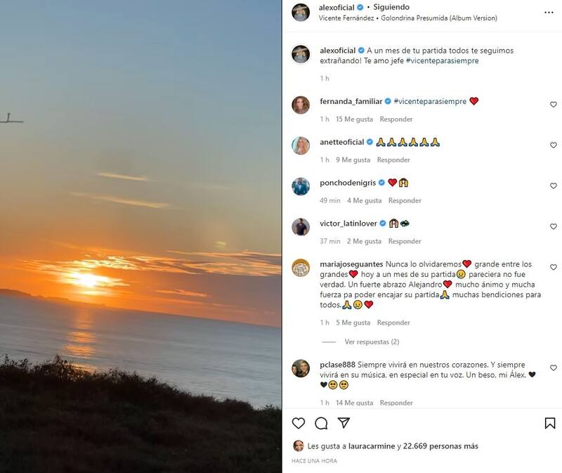 "A un mes de tu partida todos te seguimos extrañando! Te amo jefe #vicenteparasiempre", escribió "El Potrillo" al pie de un video en el que se puede ver la inmensidad del mar y un bello atardecer, mientras se escucha un fragmento del tema "Golondrina Presumida", interpretada por el "Charro de Huentitán". Hasta ahora, la publicación registra más de 22 mil reacciones y algunas condolencias.