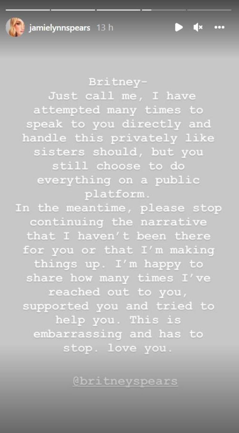 "Britney: solo llámame, he intentado muchas veces hablar contigo directamente y manejar esto en privado como deberían hacerlo las hermanas, pero aún eliges hacer todo en una plataforma pública", comenzó en el mensaje Jamie Lynn Spears.