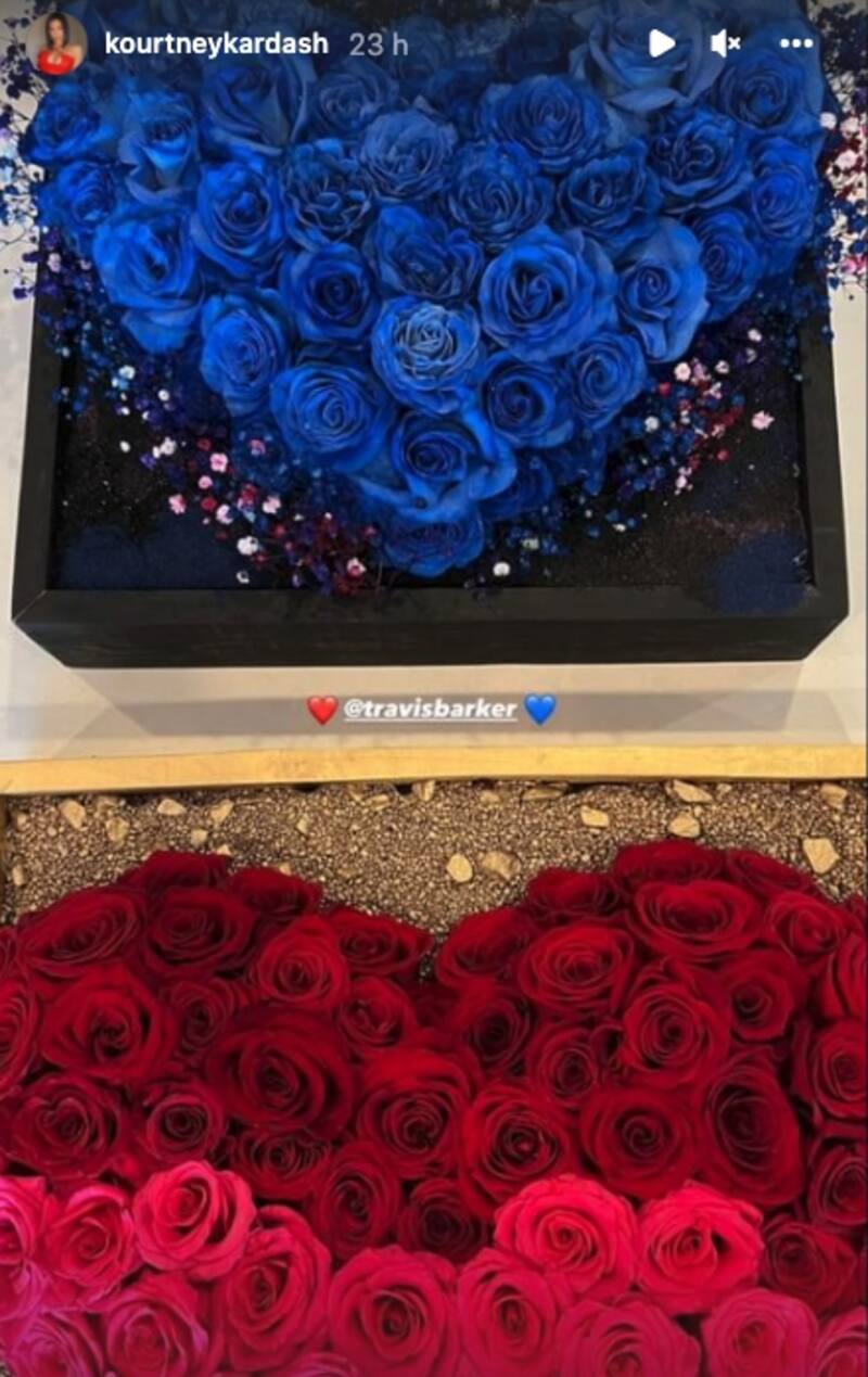 De acuerdo a algunas Instagram Stories de Kourtney Kardashian, el baterista la sorprendió al regalarle dos arreglos de rosas en forma de corazón, y aunque pareciera un regalo habitual entre cualquier pareja de enamorados, uno de ellos era de color azul.