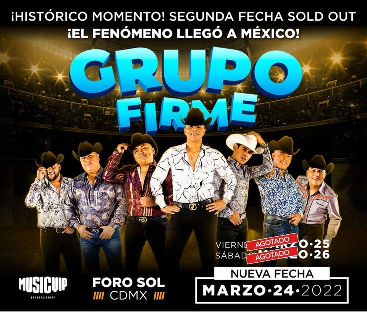 Es indudable que Grupo Firme se ha posicionado como una de las bandas más exitosas del regional mexicano. La agrupación liderada por Eduin Caz agotó en 45 minutos las localidades para su primera fecha programada en el Foro Sol el 26 de marzo, y lo mismo ocurrió con la segunda, para el viernes 25 de marzo.