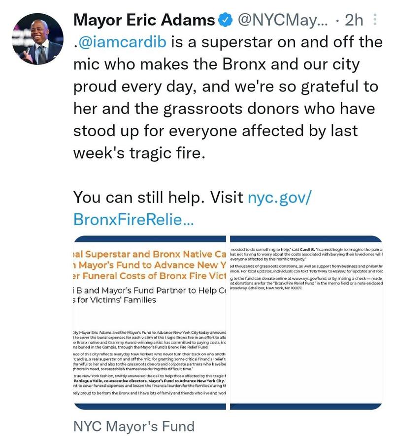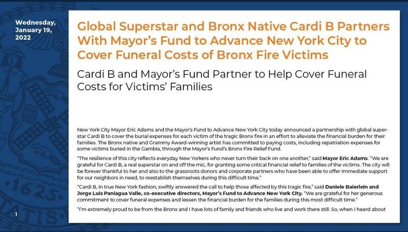 El alcalde de la ciudad de Nueva York, Eric Adams, anunció que la rapera ganadora quiere dar ayuda financiera a los deudos de las víctimas del incendio en el Bronx, lugar donde creció.