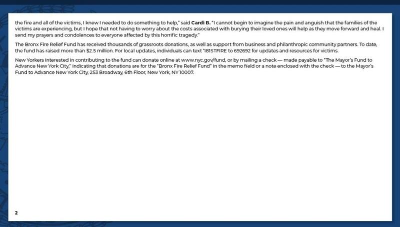 "Estoy muy orgullosa de ser del Bronx y tengo muchos familiares y amigos que todavía viven y trabajan allí. Entonces, cuando escuché sobre el incendio y todas las víctimas, supe que tenía que hacer algo para ayudar", dijo Cardi B en un comunicado.