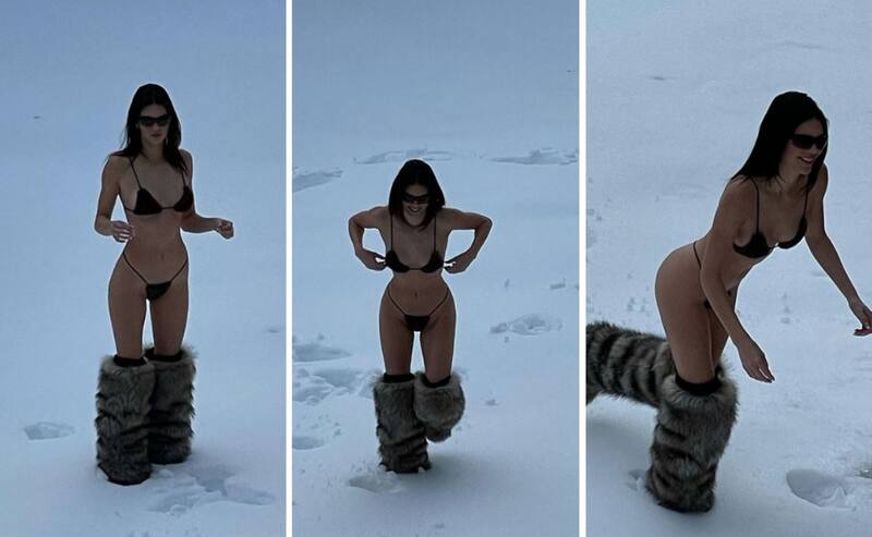 Kendall Jenner sorprendió a sus seguidores de Instagram con una serie de fotografías en las aparece vestida solo con un diminuto bikini color negro y un par de botas de peluche en medio de la nieve.