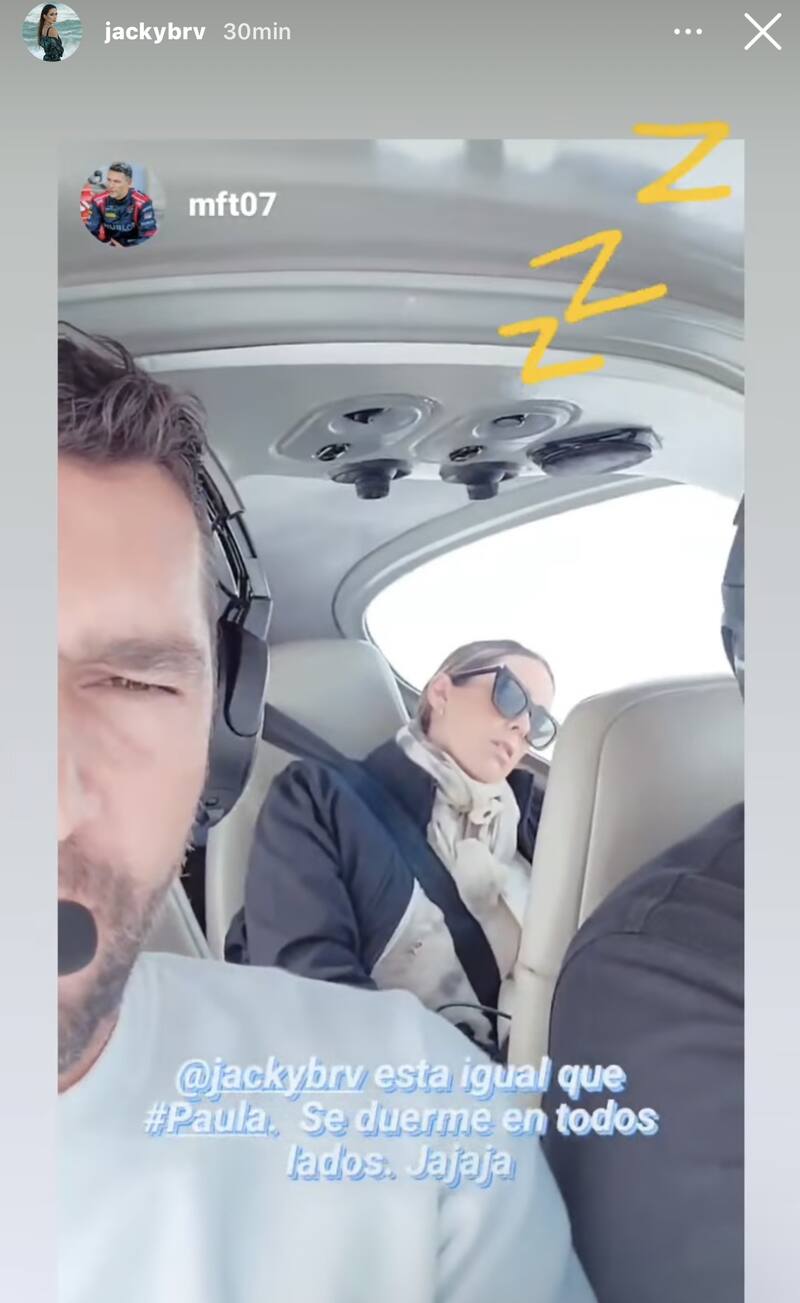 Durante el vuelo, el padre de cinco niñas compartió un video en el que aparece Jacky Bracamontes en el asiento trasero profundamente dormida. "Jacky Bracamontes está igual que Paula. Se duerme en todos lados", escribió entre risas.