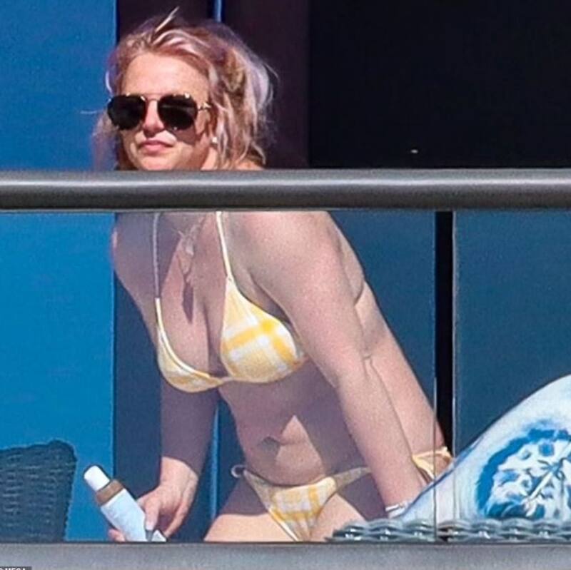 En las fotos, Britney posó con un pequeño bikini con un estampado de cuadros amarillo mostaza que dejó al descubierto uno de sus tantos tatuajes en la parte baja de su espalda. Además de unos clásicos lentes estilo aviador color oscuro.