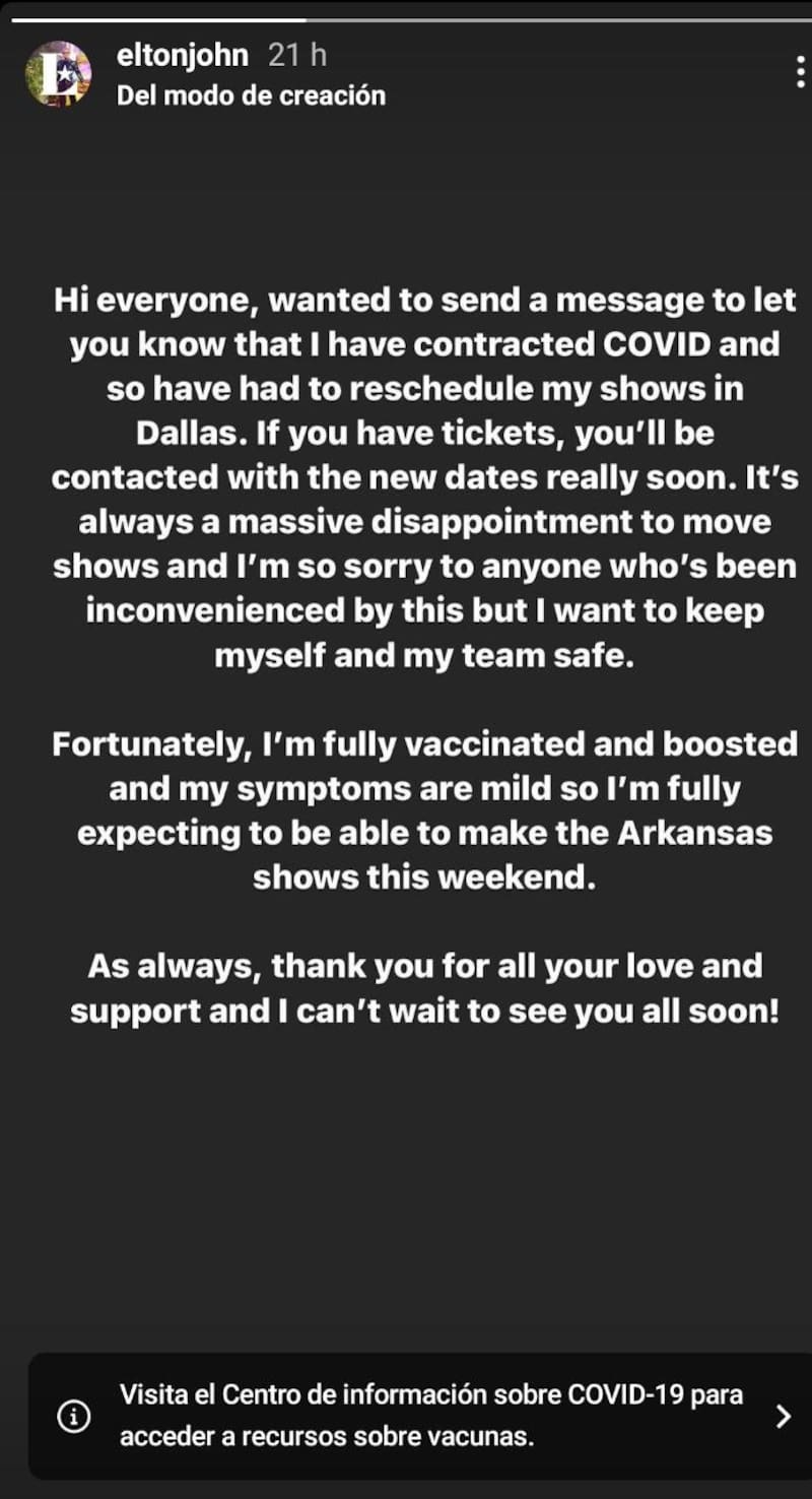 "Lamentamos mucho que las fechas de la gira Farewell Yellow Brick Road en Dallas programadas para el martes 25 y el miércoles 26 de enero deban posponerse debido a que Elton recientemente dio positivo por Covid-19”, informó a través de un comunicado que publicó en sus historias de Instagram.