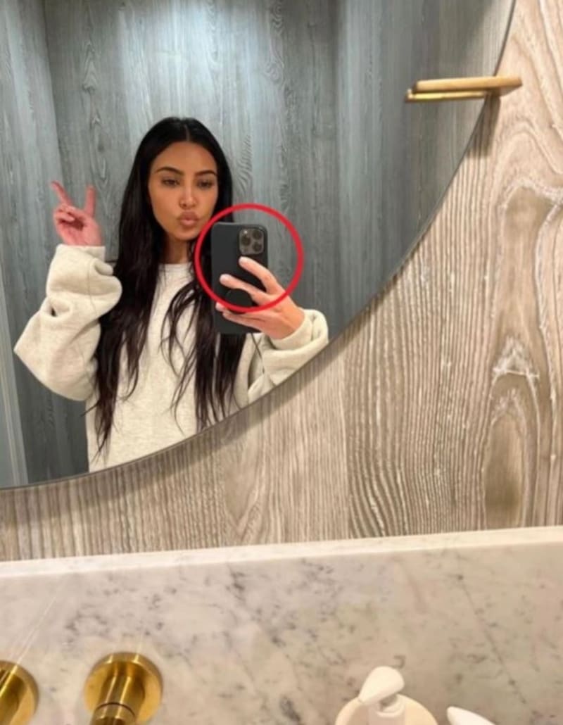 A principios del mes de enero, Kim compartió una foto en la que aparecía de frente al espejo haciendo el símbolo de amor y paz con las manos. De inmediato, usuarios de Instagram detectaron que su teléfono tenía una curva anormal, lo que les hizo suponer que había usado algún retoque para verse más delgada del rostro.