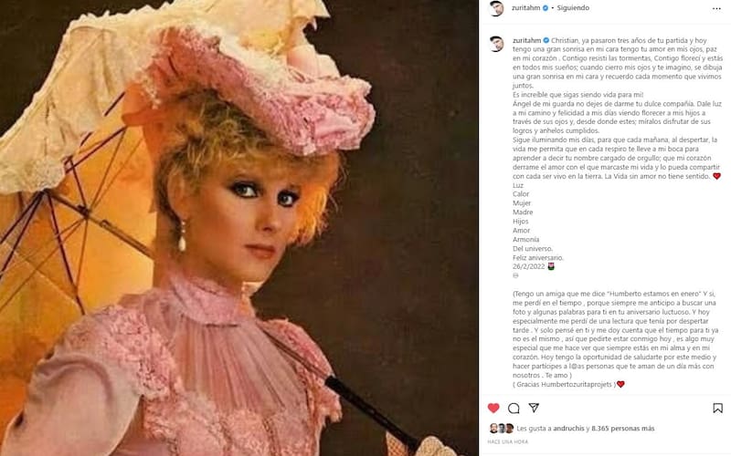 Humberto Zurita utilizó su cuenta de Instagram para dedicarle a su fallecida esposa, la actriz Christian Bach un emotivo mensaje a tres años de su muerte.