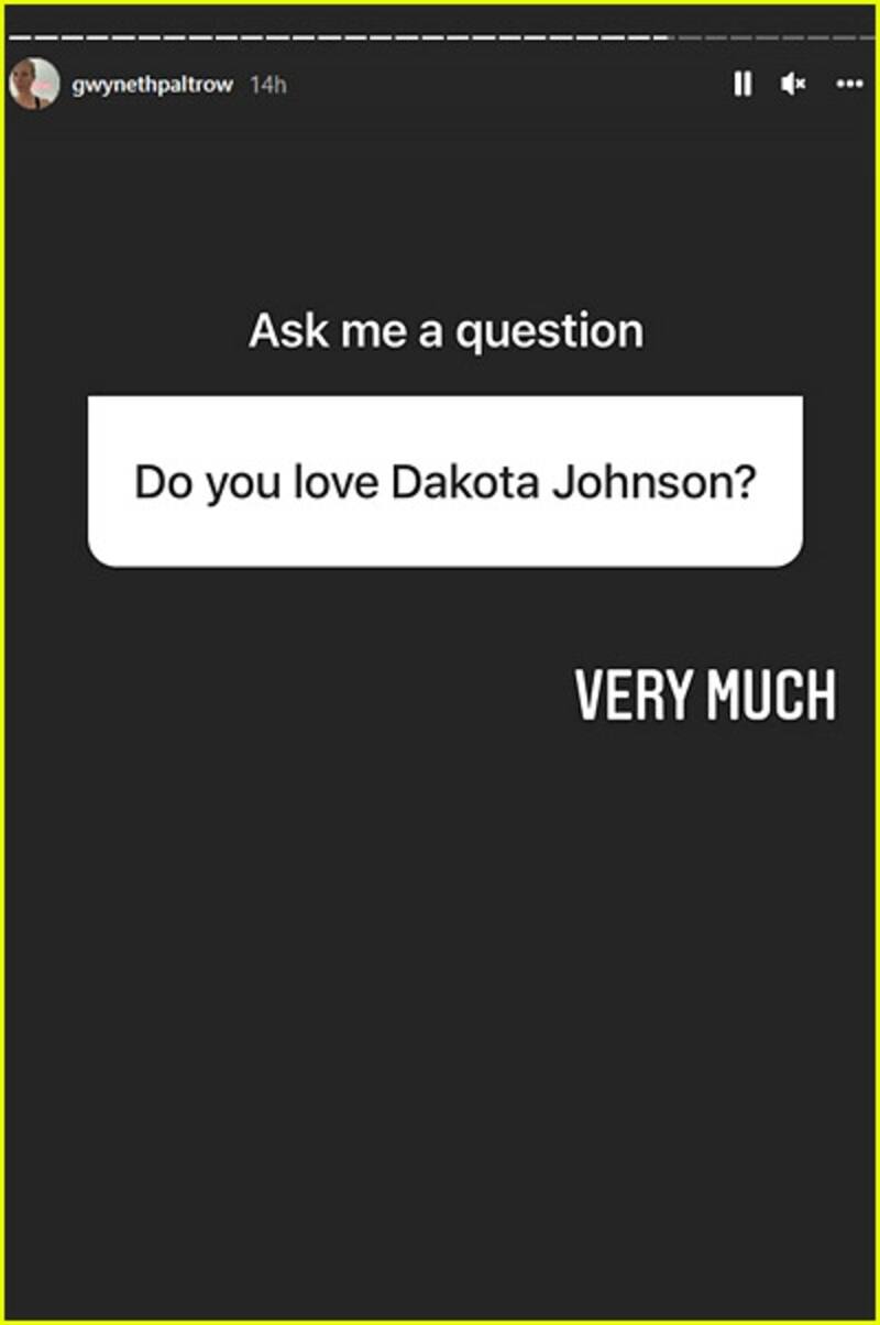 Hace pocos días Paltrow, realizó en su Instagram "preguntas y respuestas" con sus seguidores. Entre todas las preguntas que le llegaron, la ganadora del Oscar, escogió la siguiente pregunta "¿quieres a Dakota Johnson?" a lo que le respondió con un "very much".