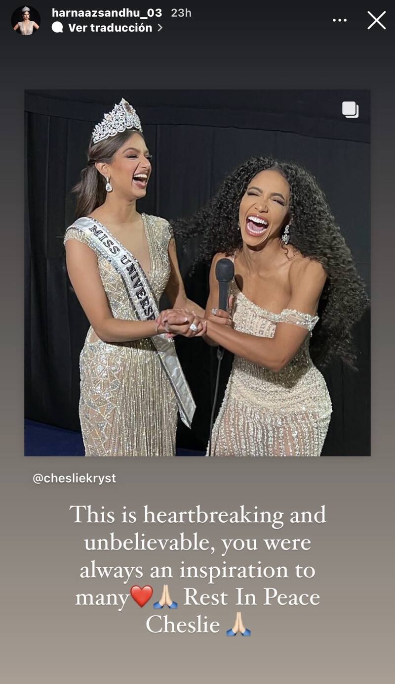 Cheslie Kryst, quien era conocida por tener una personalidad energética y muy divertida, había conocido a Harnaaz Sandhu tras entrevistarla para ExtraTV minutos después de ser coronada como la nueva Miss Universo. La modelo estadounidense presumió el momento en una publicación en la que felicitaba a Sandhu por su logro.