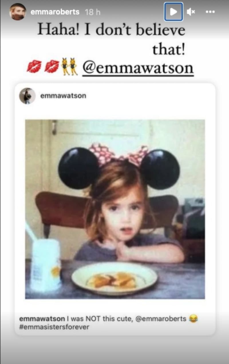 Emma Roberts reaccionó ante la publicación en Emma Watson, y a través de sus Instagram Stories, replicó la publicación en la que escribió: "Haha! Yo no creo eso @emmawatson", junto a algunos emoticonos.