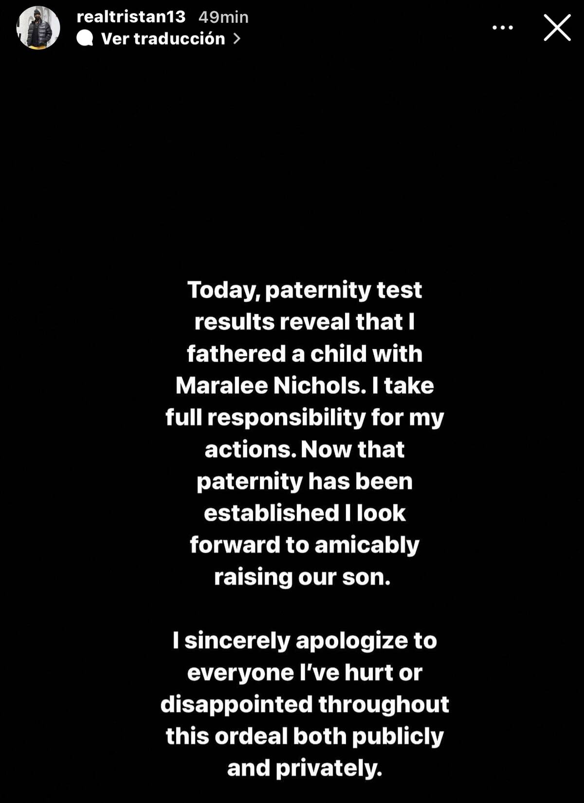 Recientemente compartió a través de historias de Instagram una confirmación del test de paternidad del bebé de Maralee mencionando que acepta la responsabilidad que conlleva y se disculpa con todas las personas que con esta batalla legal lastimó de forma pública y privada.
