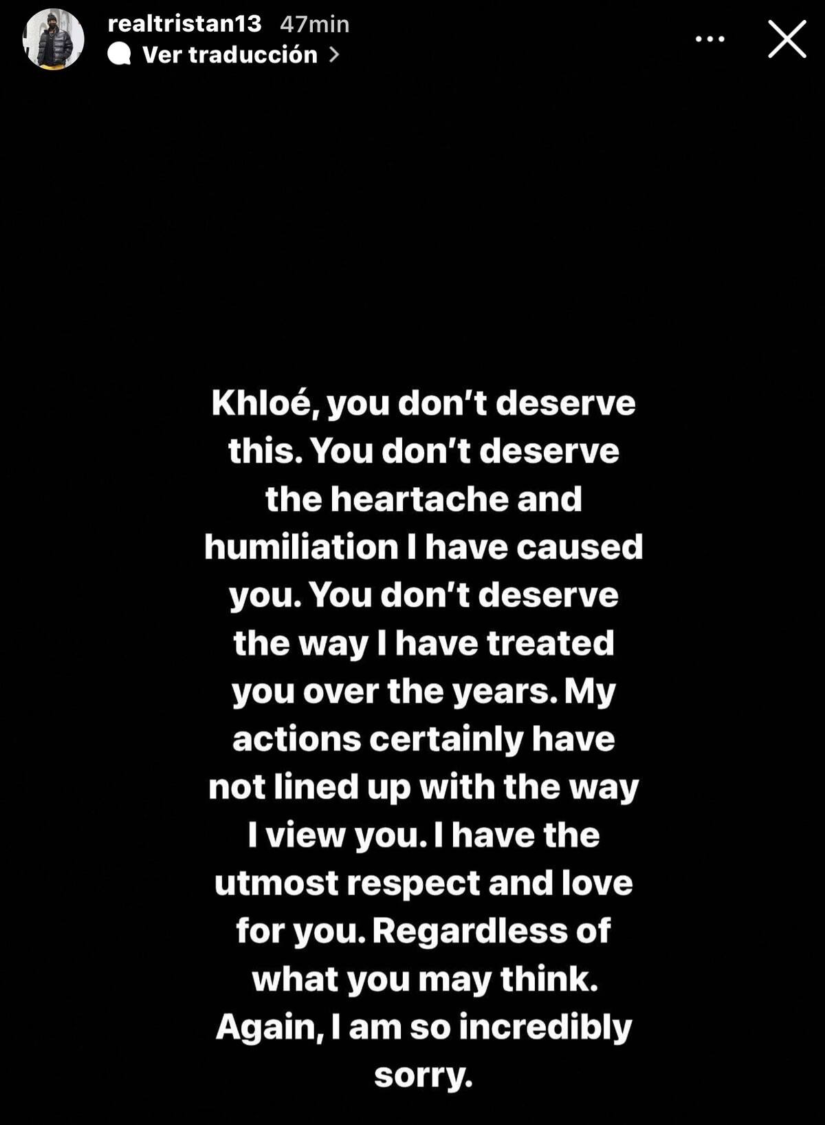 "Khloé, no te mereces esto. No te mereces el dolor de cabeza y la humillación que te he causado. No te mereces la forma en la que te he tratado estos años. Mis acciones definitivamente no se alinean con cómo te veo. Te respeto y te amo muchísimo, a pesar de lo que puedas creer. Otra vez, realmente lo siento", escribió en la segunda historia.