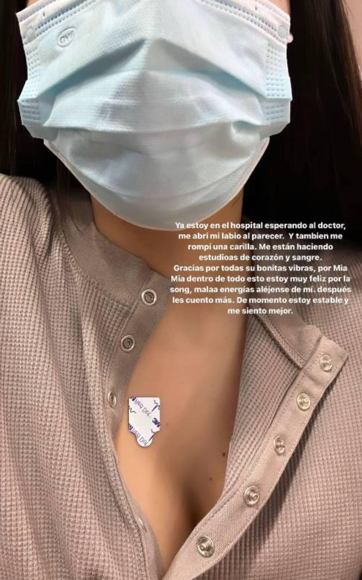 No tardó en volver a actualizar a sus seguidores diciendo que “ya estoy en el hospital esperando al doctor, me abrí el labio al parecer. Y también me rompí una carilla. Me están haciendo estudios de corazón y sangre”.