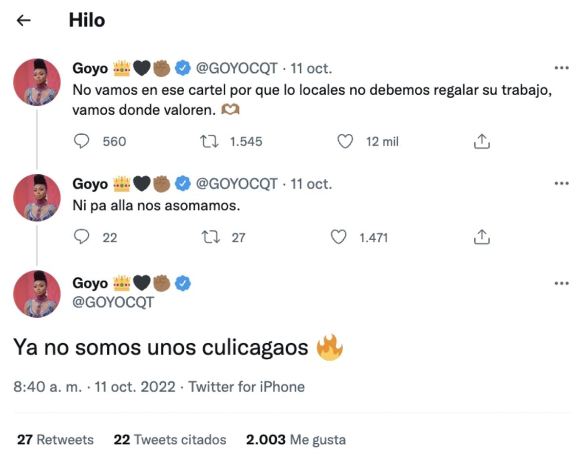 Gloria Martínez, más conocida como 'Goyo', cantante de la banda, aprovechó la oportunidad del anuncio para insinuar que el festival no le da la importancia a los artistas nacionales: "No vamos en ese cartel porque los locales no debemos regalar su trabajo, vamos donde valoren" publicó en su Twitter, que cuenta con más de 240 mil seguidores.