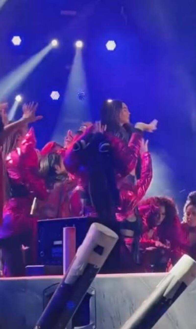 En redes sociales circularon videos del épico momento, ya que mientras en una de las pantallas era proyectada la peculiar oración, Belinda comenzó a cantar: “Enculao, apretao, sigue bailando con los ojos cerraos, enculao, apretao” y bailó de forma sugerente en el escenario.