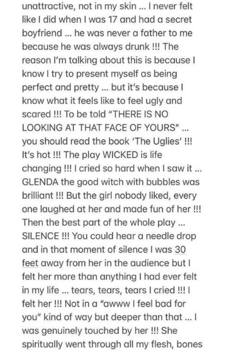 “Vi esta foto y decía: ‘wow, ¿¿¿cómo yo solía pensar cuando era bonita??? ¿¿¿cómo me sentía cuando me despertaba por las mañanas??? ¿¿¿los hombres me respetarían si me sintiera bonita como entonces???”, se lee en uno de los últimos párrafos.