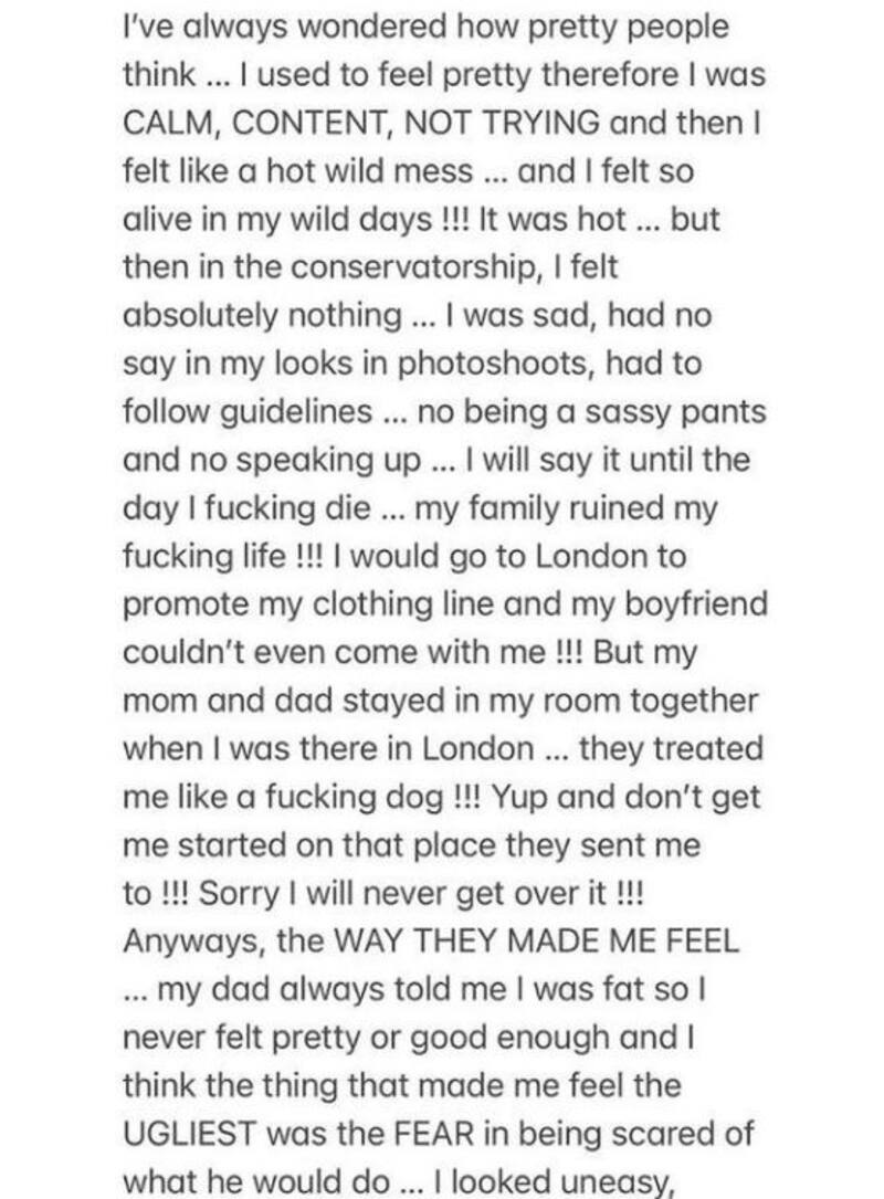 En la extensa publicación, la "princesa del pop" asegura que su padre la trató como a un "perro" y siempre hizo comentarios sobre su cuerpo que le generaron muchas inseguridades con las que tuvo que lidiar por mucho tiempo.