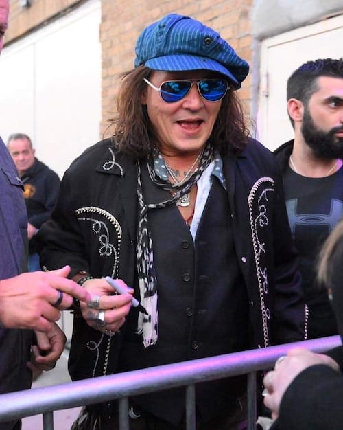 Afuera del teatro donde el fin de semana tocó junto a Jeff Beck, el célebre guitarrista de 78 años con el que realiza una gira por Estados Unidos promocionando el material que hicieron en conjunto titulado "18", Depp firmó autógrafos a sus fans y se tomó selfies con algunos de ellos.