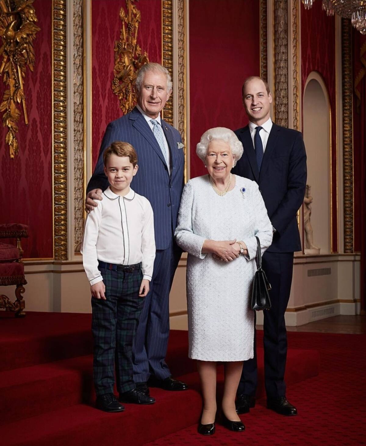 El retrato fue tomado por el fotógrafo Ranald Mackechnie en el Salón del Trono del Palacio de Buckingham. El Príncipe George luce un par de pantalones de tartán en la foto, mientras que la Reina sonríe a su lado con un vestido azul claro mientras lleva su bolso característico.
