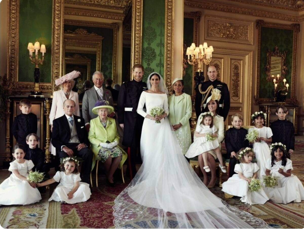 La instantánea fue tomada por el fotógrafo Alexi Lubomirski en el Castillo de Windsor después de su ceremonia de boda en la Capilla de San Jorge y muestra al príncipe Harry y Meghan rodeados por miembros de su joven cortejo nupcial. La reina Isabel está sentada junto a los novios junto al príncipe Felipe , con Carlos y Camilla de pie detrás de la difunta pareja real.